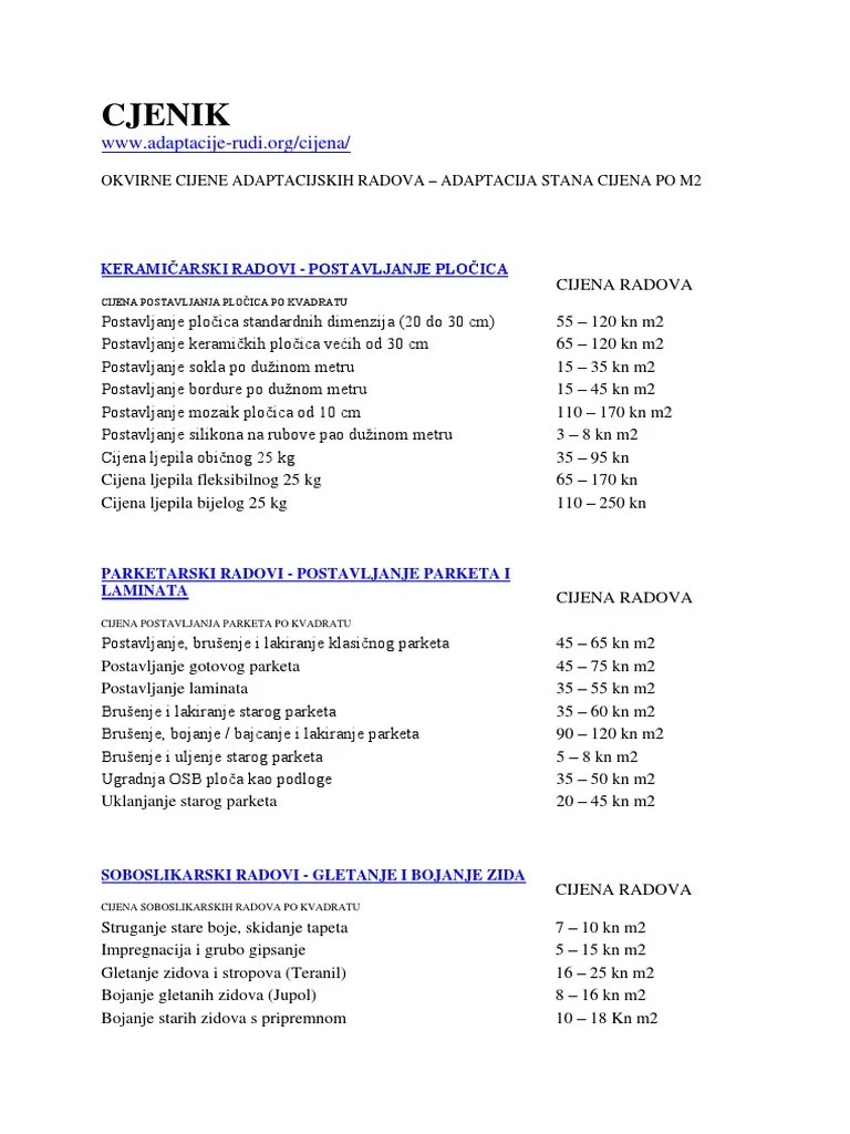 Cijene obuhvaćaju sav potreban materijal za izvođenje i uslugu izvođača radova... Kod novogradnje, preuređenja (adaptacija) i uzdržavanja. Izračunava se po kvadratnom metru.