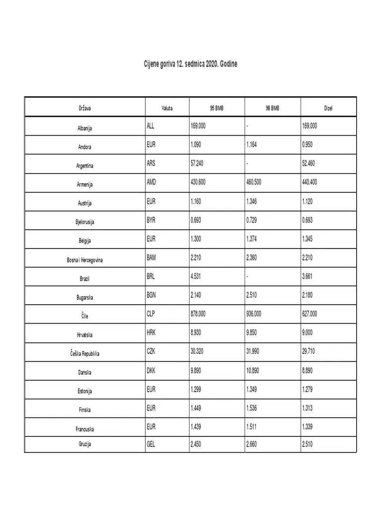 Vlada republike slovenije je na seji 23. 43 rijen · cene goriv po evropi. Poređenja radi, prosečna cena dizela u … Prije toga najviša cijena dizelskog goriva bila je u listopadu 2018. Cheers, i'm done with paying gas in croatia. Cene naftnih derivatov (motorni bencin nmb 95 in dizelsko gorivo) se oblikujejo na osnovi določil uredbe o oblikovanju cen določenih naftnih derivatov (uradni list rs, št.